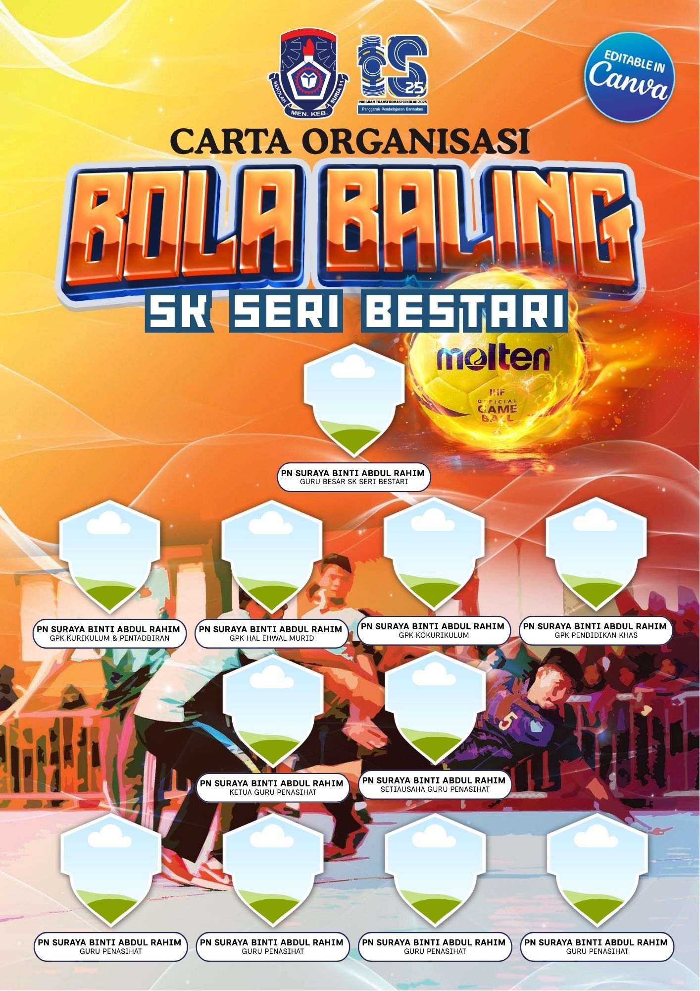 Template Carta Organisasi Sukan Permainan Bola Baling yang kemas dan boleh terus edit di CANVA.