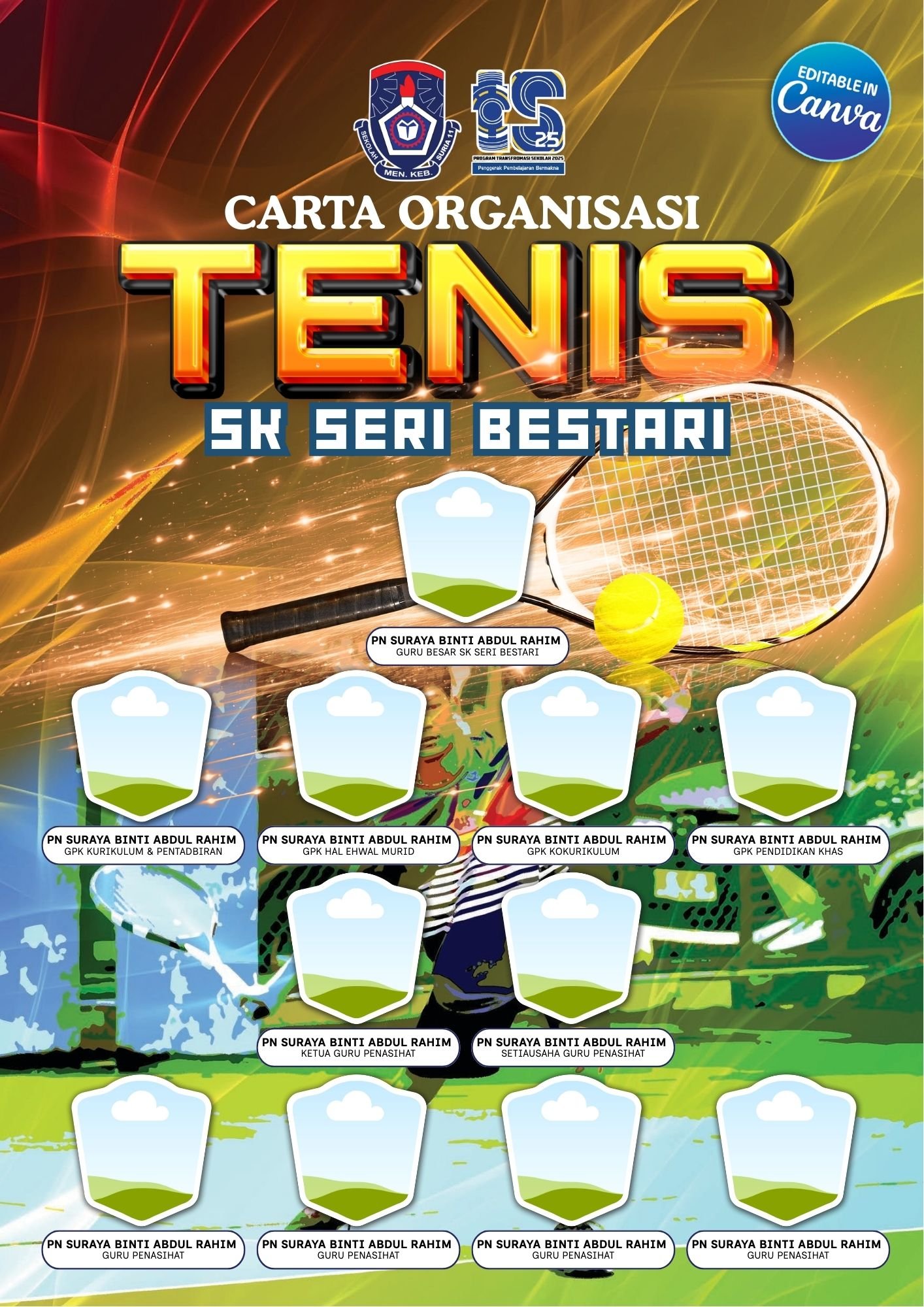 Template Carta Organisasi Sukan Permainan Tenis yang kemas dan boleh terus edit di CANVA.