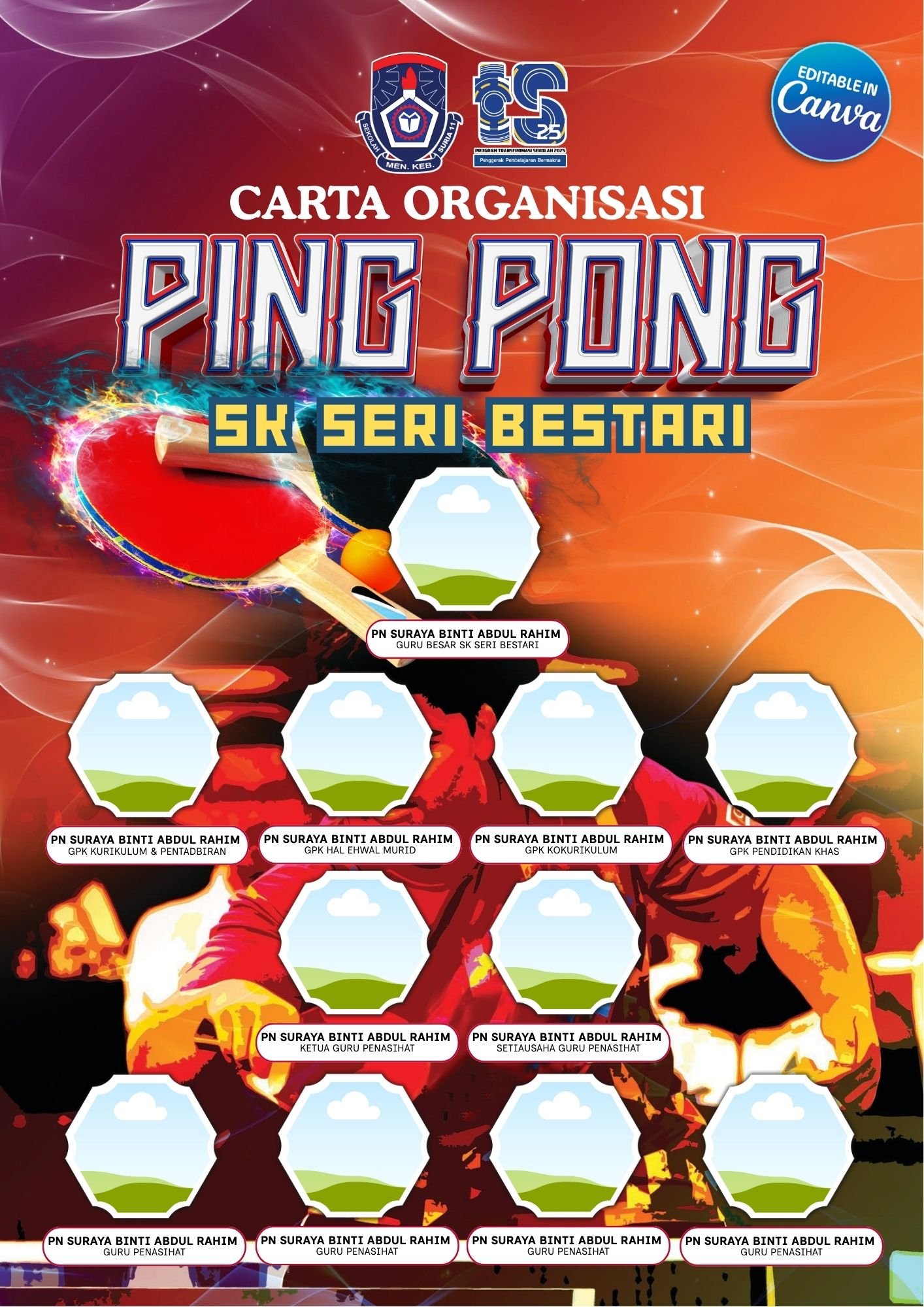 Template Carta Organisasi Sukan Permainan Ping Pong yang kemas dan boleh terus edit di CANVA.