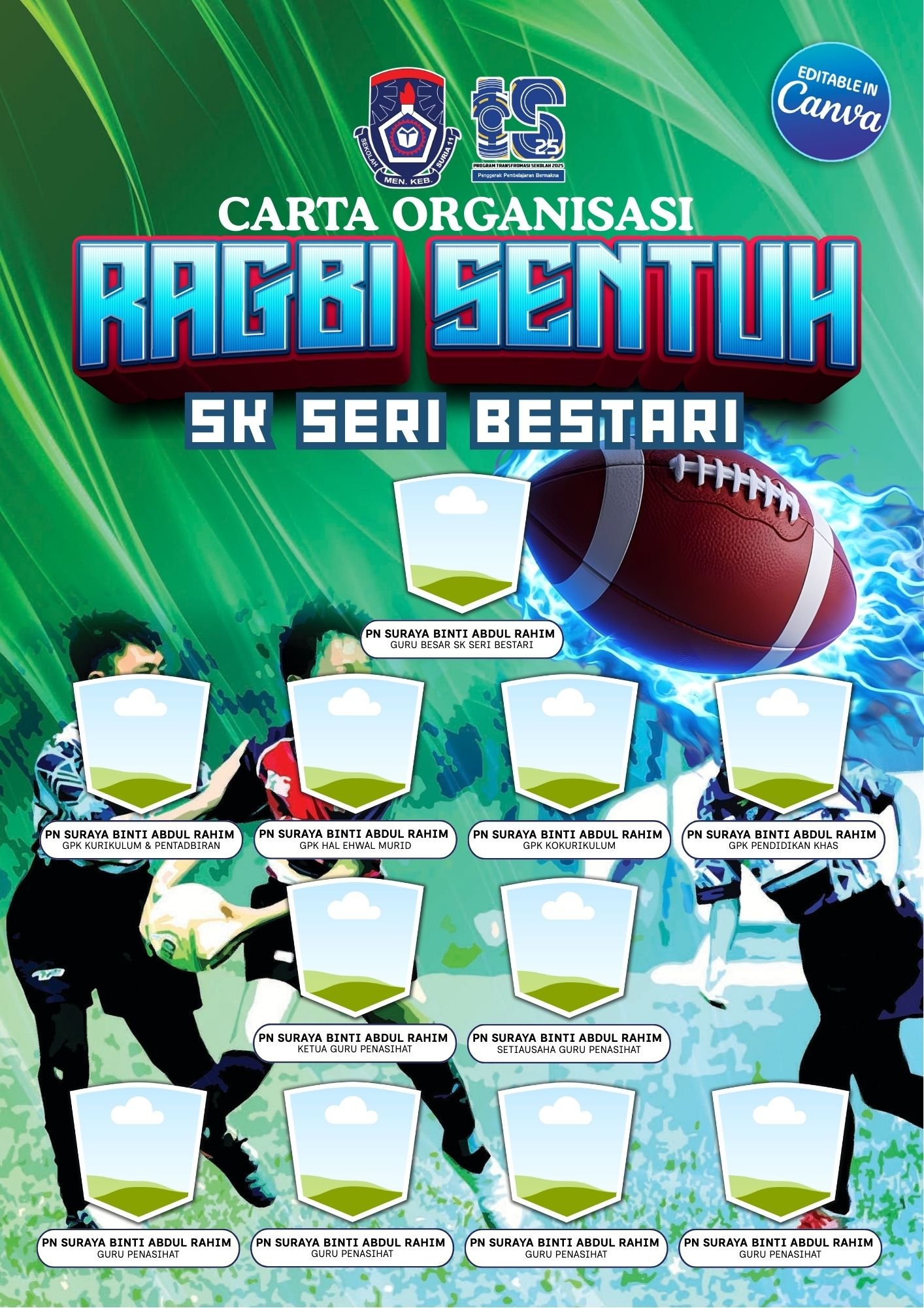 Template Carta Organisasi Sukan Permainan Ragbi Sentuh yang kemas dan boleh terus edit di CANVA.
