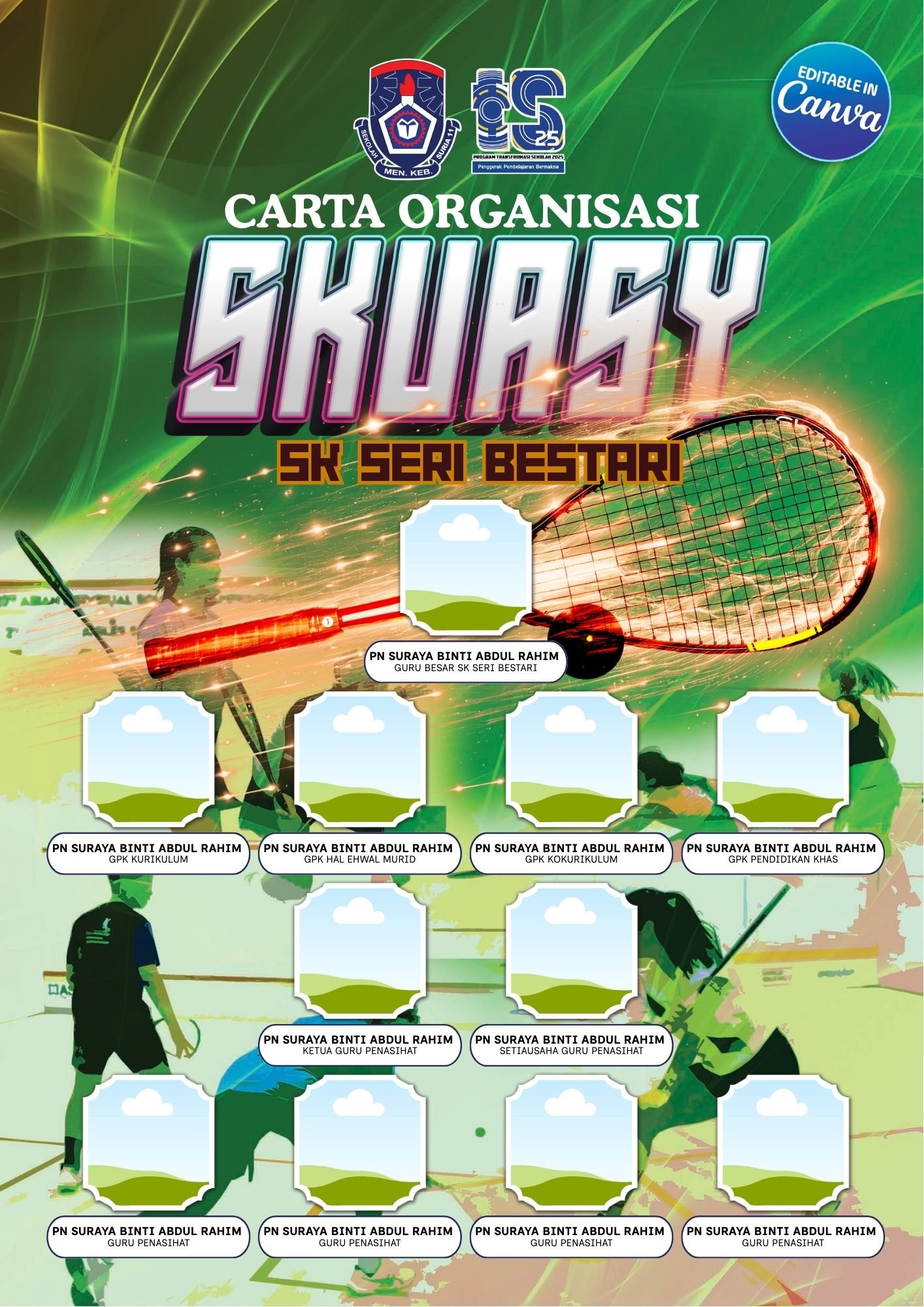 Template Carta Organisasi Sukan Permainan Skuasy yang kemas dan boleh terus edit di CANVA.
