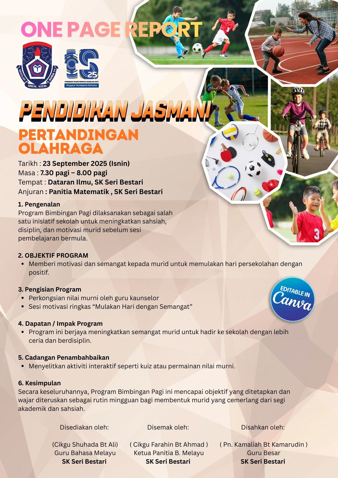 One Page Report Panitia Pendidikan Jasmani yang kemas dan boleh terus edit di CANVA.