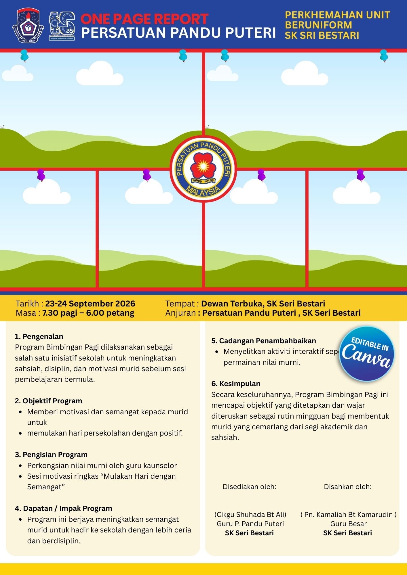 Template OPR Badan Uniform Persatuan Pandu Puteri Malaysia yang kemas dan boleh terus edit di CANVA.